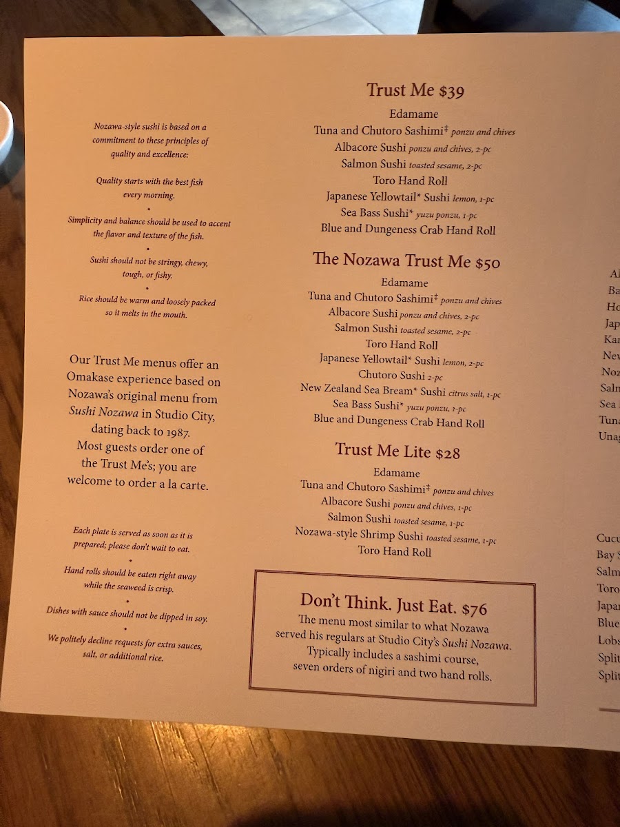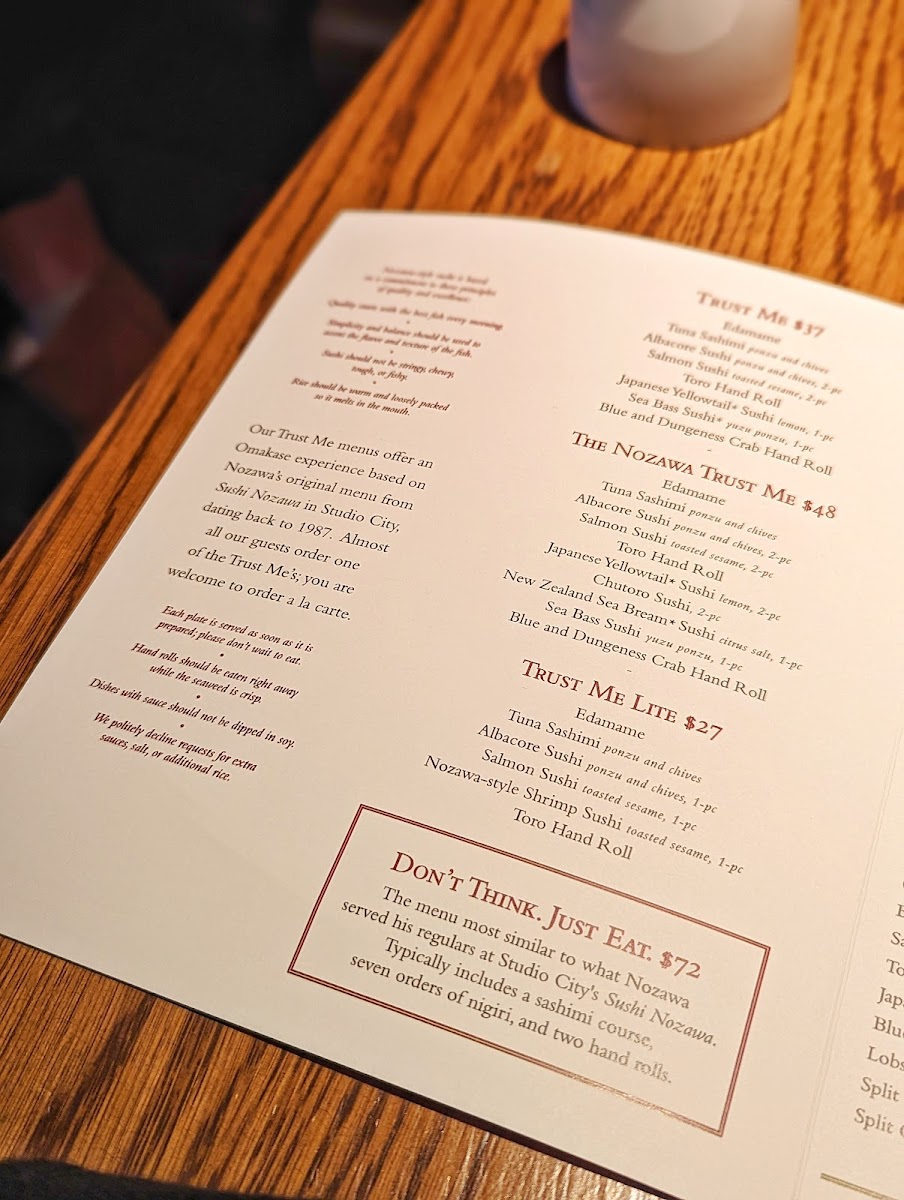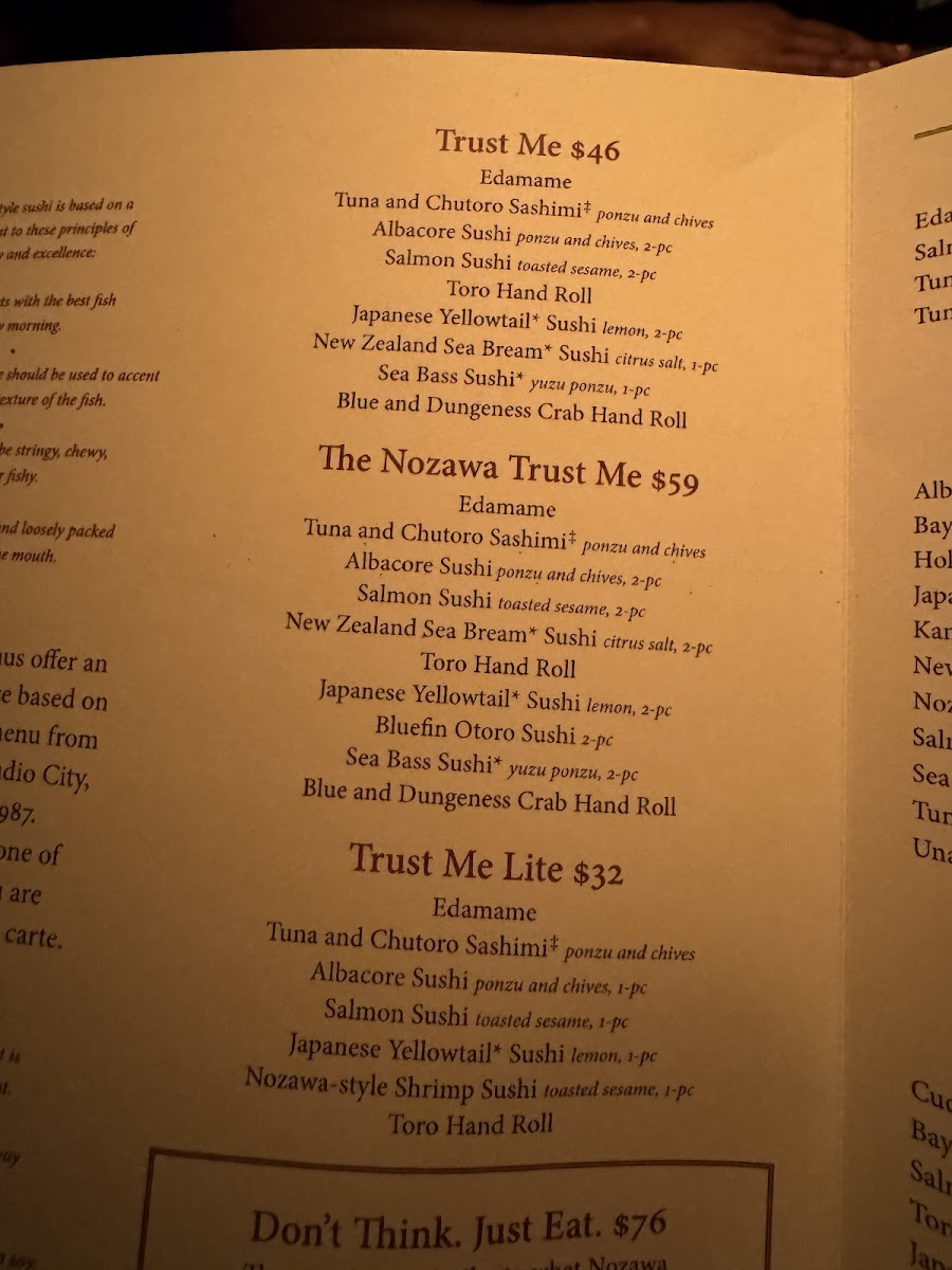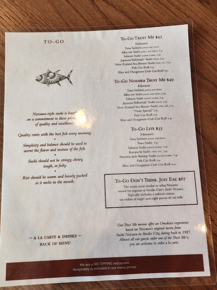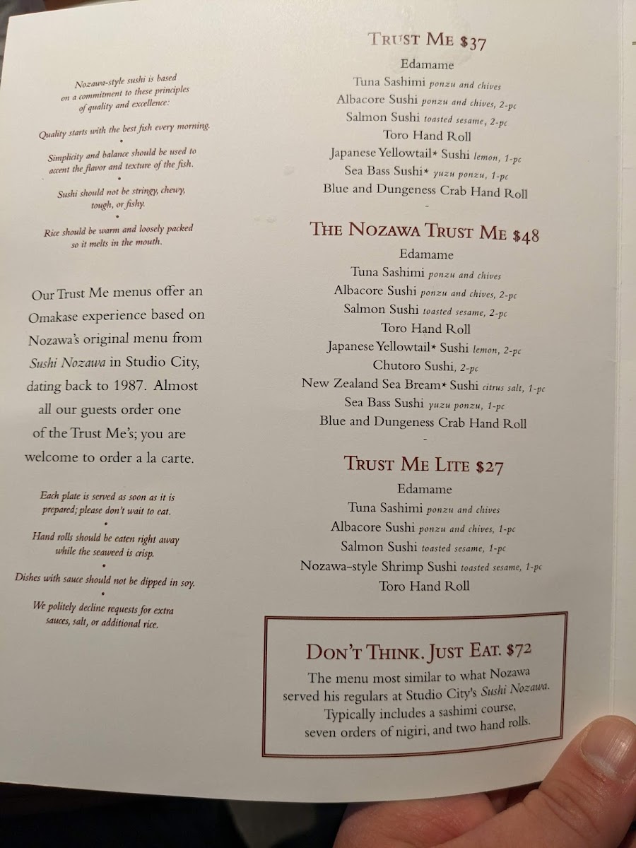 The menu most similar to what Nozawa served his regulars at Studio City's Sushi Nozawa. Typically includes a sashimi course, seven orders of nigiri, and two hand rolls
