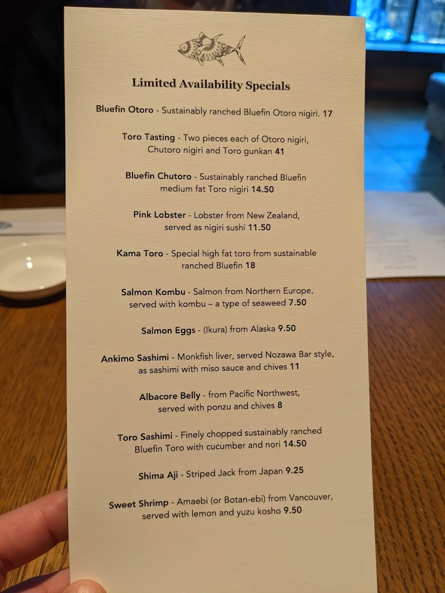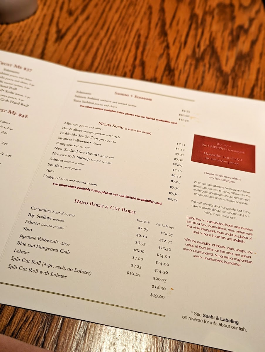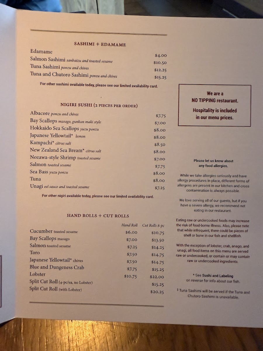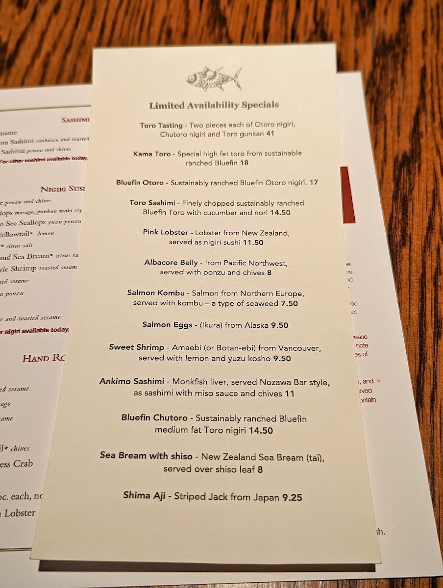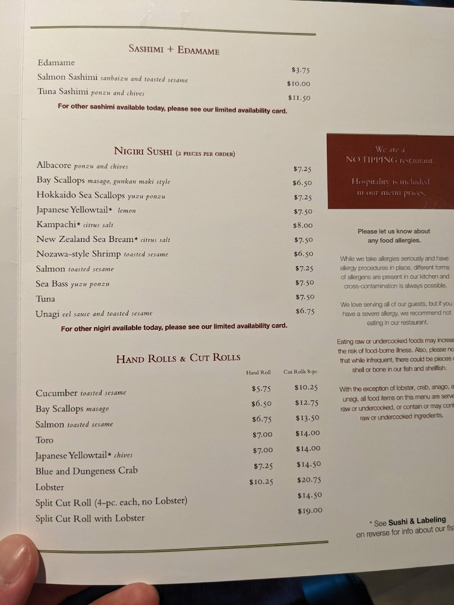 The menu most similar to what Nozawa served his regulars at Studio City's Sushi Nozawa. Typically includes a sashimi course, seven orders of nigiri, and two hand rolls